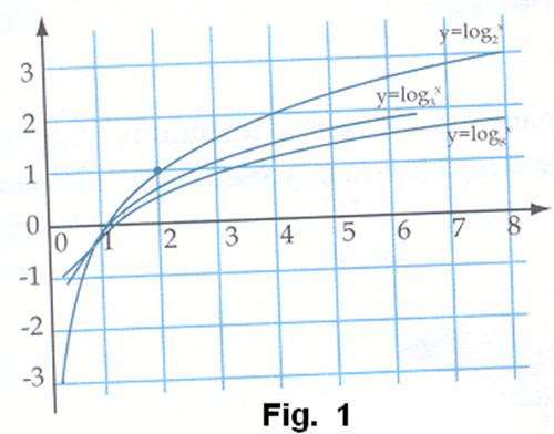 Nё figurёn 1 janё paraqitur grafikёt e funksioneve log2x, log5x , log8x ( nё tё tri rastet a >1) , kurse nё figurёn 2 janё paraqitur grafikёt e funksioneve log1/2x, log1/5x , log1/6x ( nё tё tri kёto rastё a < 1 )